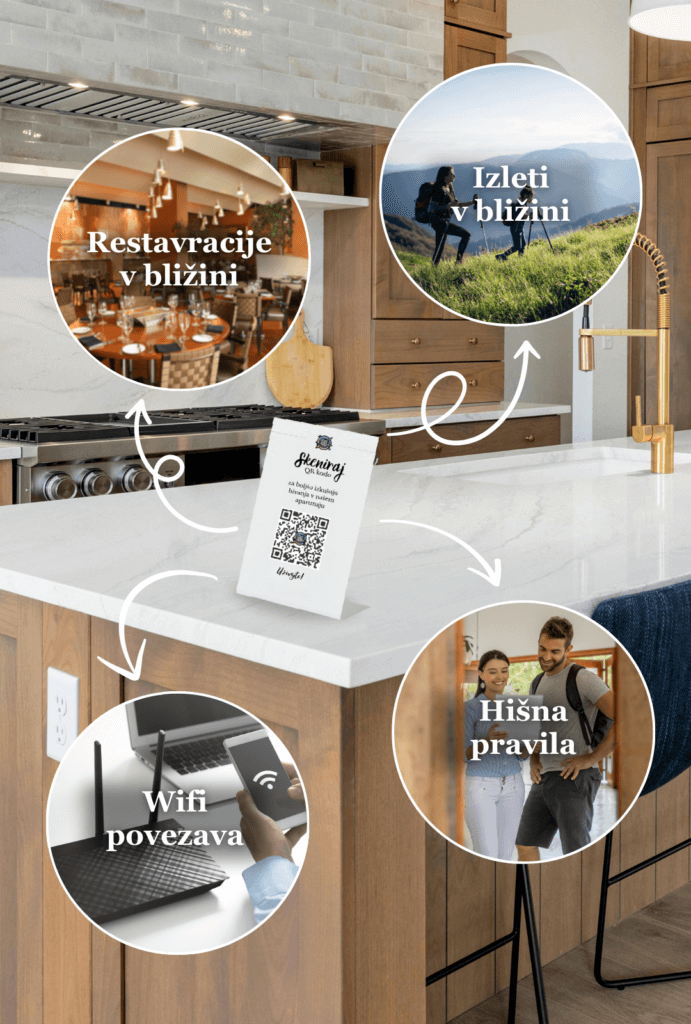 Preko NFC ploščka, ki ga gost preprosto dotakne s telefonom ali preproste QR kode, takoj pridobi vse ključne podatke: WiFi geslo, hišna pravila, kontaktne informacije, a to še ni vse!